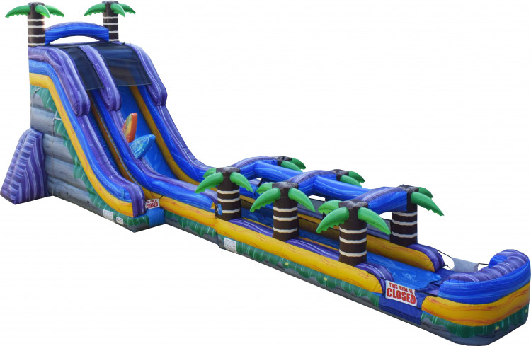 Vibrant and Inviting Design: The slide features a lively and tropical theme, complete with bright colors and fun graphics that evoke the excitement of a big wave surfing adventure under the palm trees. It’s a visual centerpiece that attracts and delights guests of all ages.