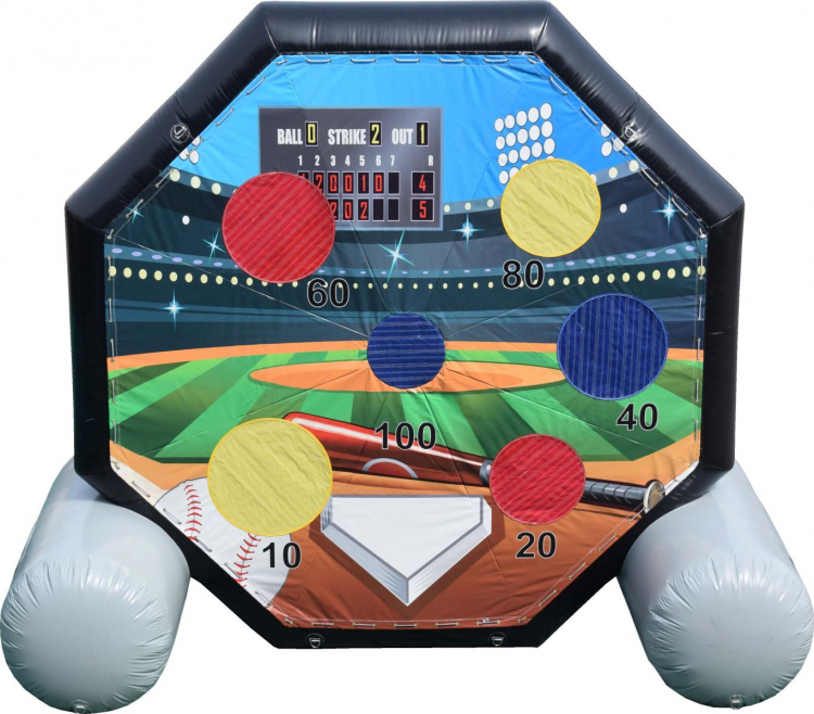1Giant Baseball Darts. This interactive sports game will get your event Jumping. Participants attempt to throw the sticky baseball against the Velcro-backed target. This game is much larger than the picture portrays. It stands nearly 20 feet tall!!!