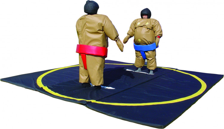 1Sumo Suits. The Sumo Game includes a set of two sumo suits, a safety mat, and headgear. These fit teenagers to adults only.
