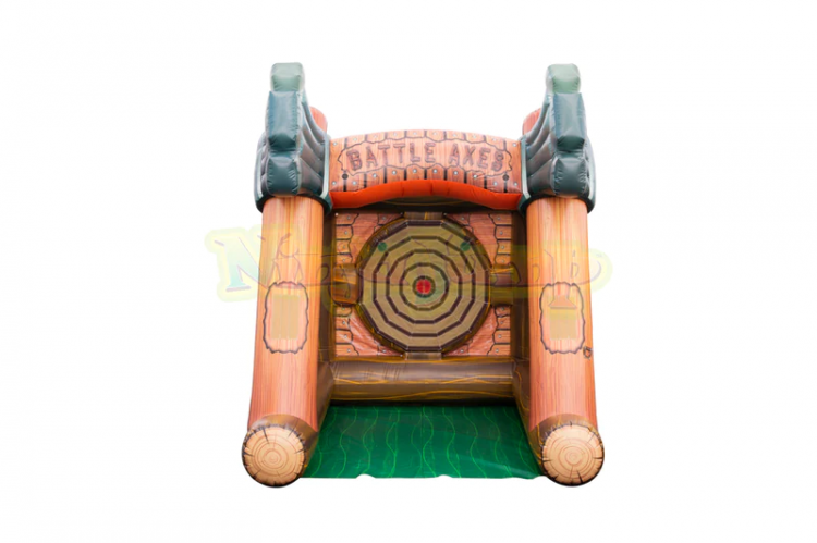 1Battle Axes inflatable Axe throwing game will help you hit the bull's eye in your party planning. Participants use weighted axes with velcro on end and throw them toward the target. The axes rotate like throwing a real axe and stick to the target.