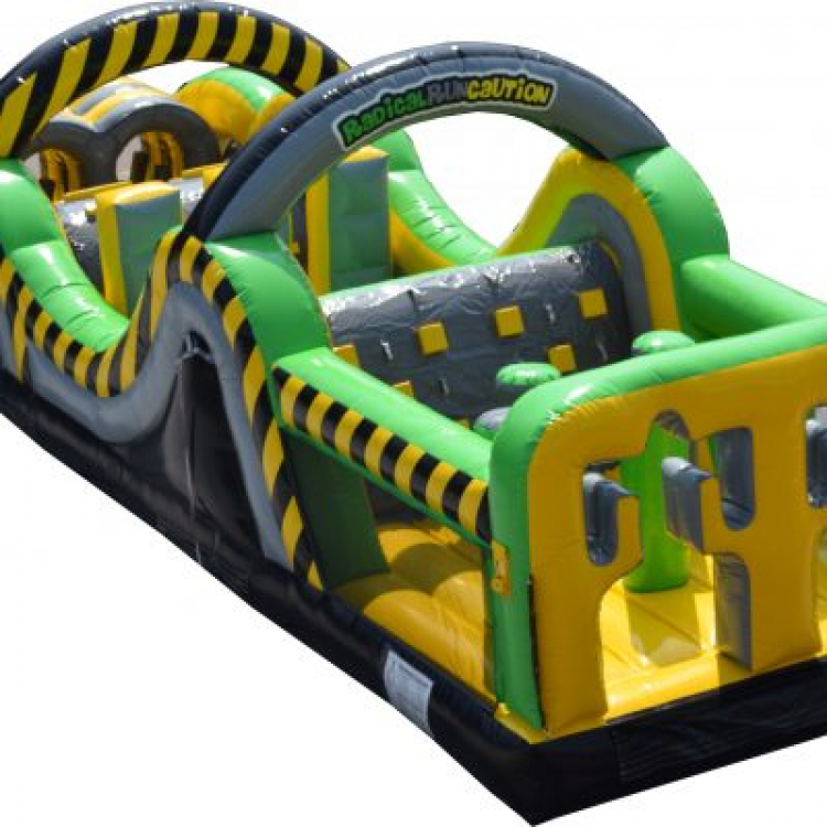 165' Radical Run Obstacle Course & Slide. This Radical Caution-themed Rock Climbing Slide and obstacle course will provide 65' of thrill for those that work their way through. This piece can be joined to the Radical Obstacle Course 30' piece for a 95' obstacle.