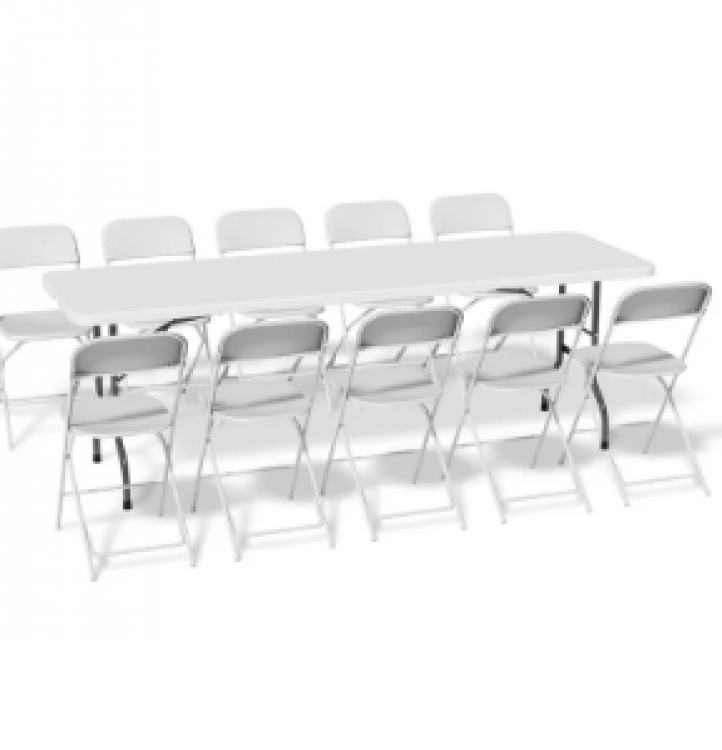 Quality and Comfort: The tables and chairs are selected for their quality and comfort. The round tables encourage social interaction and offer a touch of elegance, while the white folding chairs are sturdy and provide comfortable seating for the duration of your event.