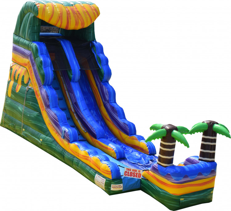 Vibrant Tropical Theme: Adorned with lush, colorful graphics of palm trees and bright tropical motifs, this slide not only provides an exciting ride but also adds a visually stunning element to any event. It's like bringing a piece of paradise right to your backyard or event venue!